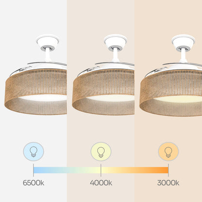 Ventilateur de plafond avec lumière et lampe en corde, ultra-silencieux, 3 pales rétractables ø106 cm, moteur 40W, 6 vitesses, fonction été-hiver, programmable et avec télécommande.