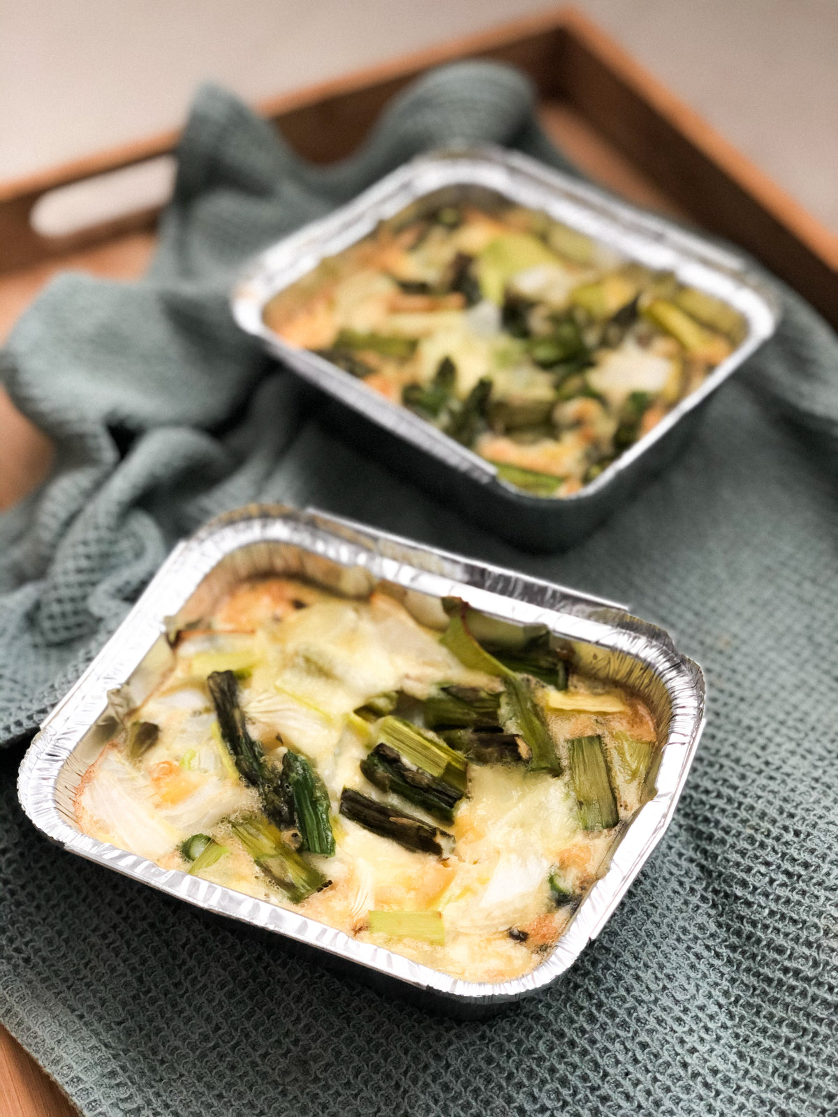 - Lavare e tagliare la cipolla e il porro in pezzi. Lavare gli asparagi dei trigueri, rimuovere lo stelo e tagliare il resto. Prenota la verdura.