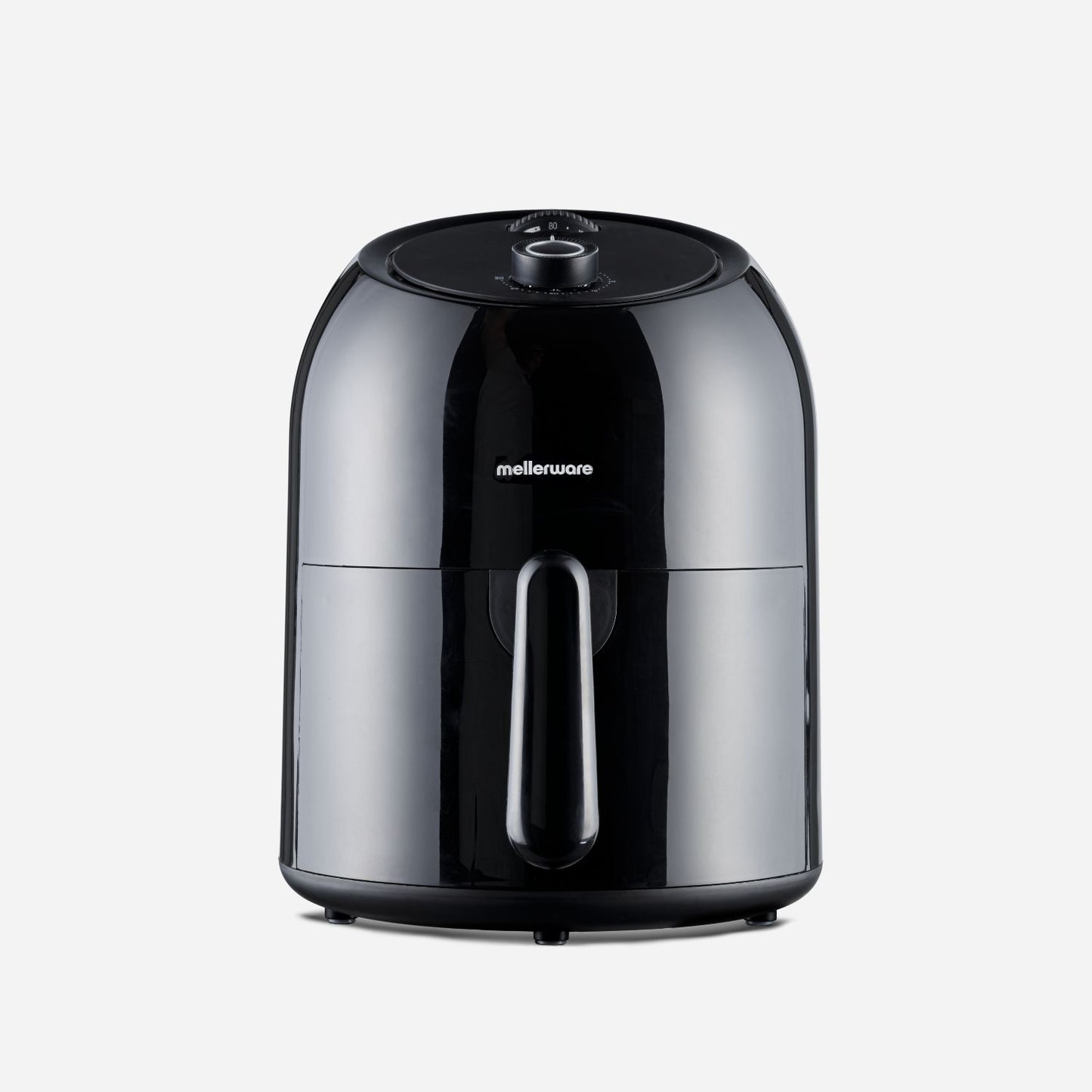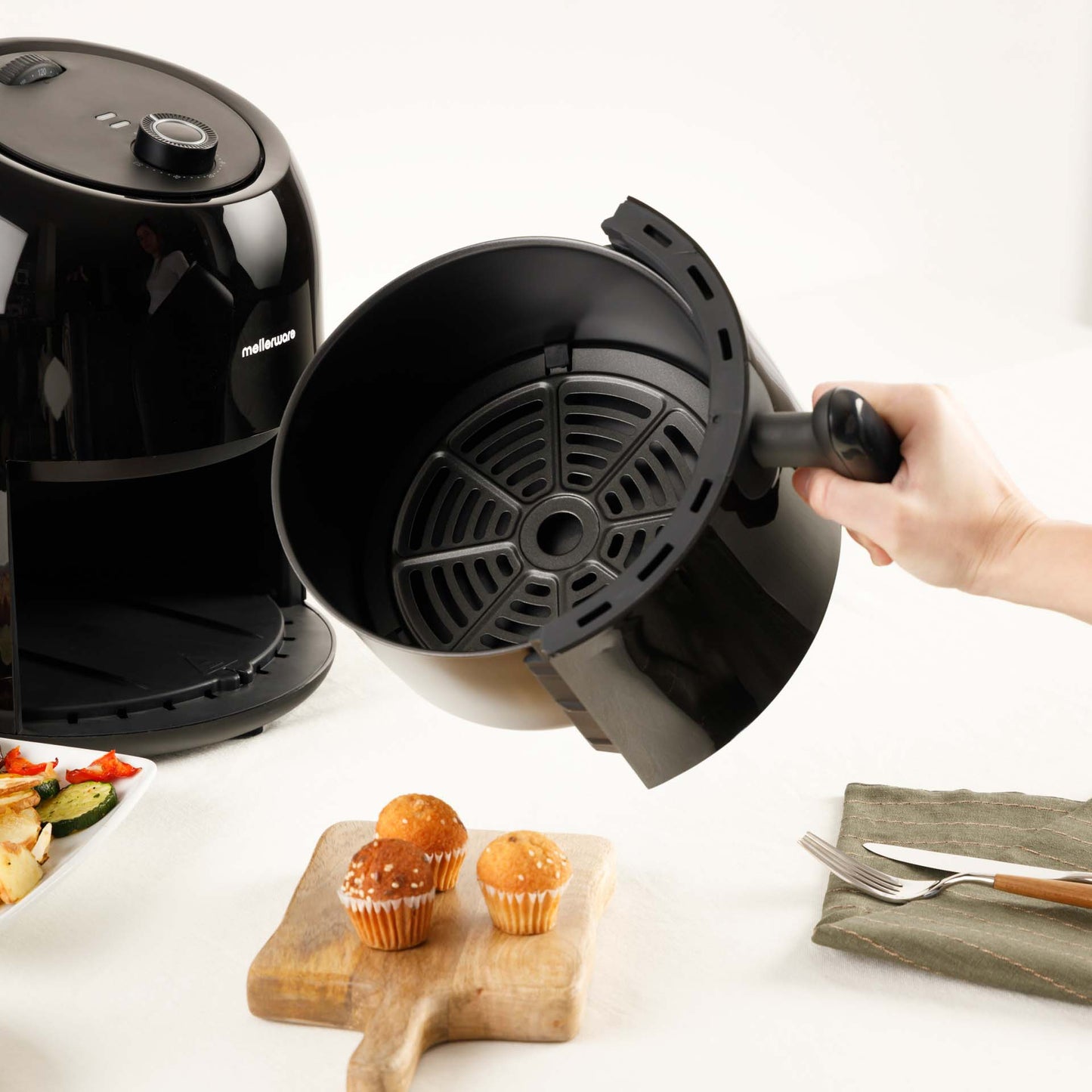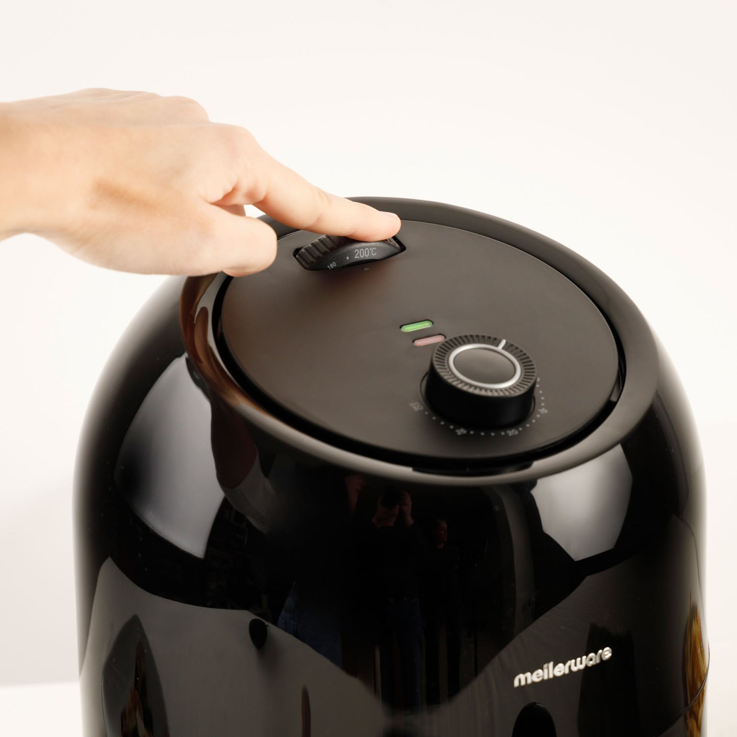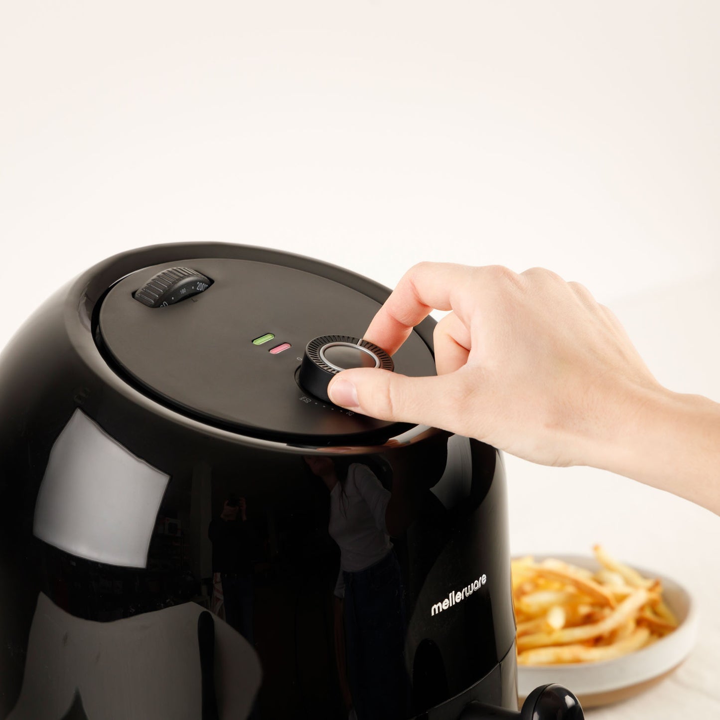 Friggitrice ad aria da 1000W per cucinare senza olio, con una capacità di 3,5L (2 porzioni), temperatura regolabile fino a 200 °C e timer. Cestello lavabile in lavastoviglie.