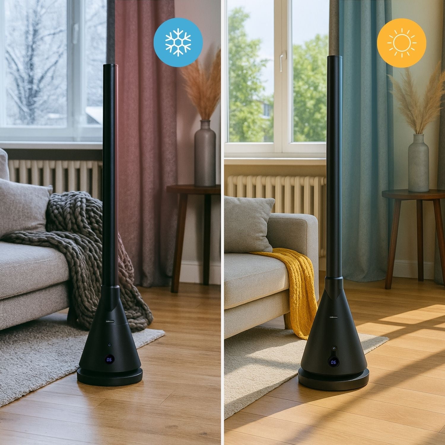 Torre de ventilación y calefacción que te acompaña tanto en verano como en invierno. Con 30 W como ventilador y 1800 W como calefactor, refresca con suavidad o calienta rápidamente la estancia según la temporada.