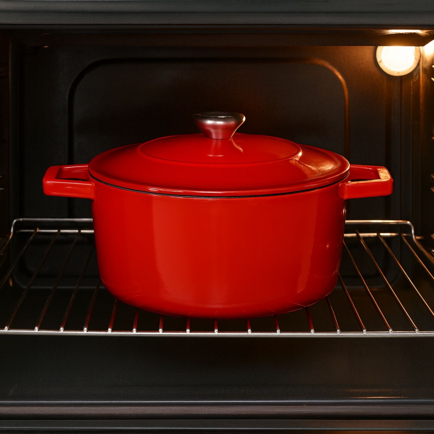 Cacerola de hierro fundido ø26cm, perfecta para cocinar para 3-5 personas. Compatible con todo tipo de cocinas y horno, cuenta con un cuerpo de hierro fundido esmaltado, recubrimiento antiadherente y un pomo resistente hasta 260 ºC.