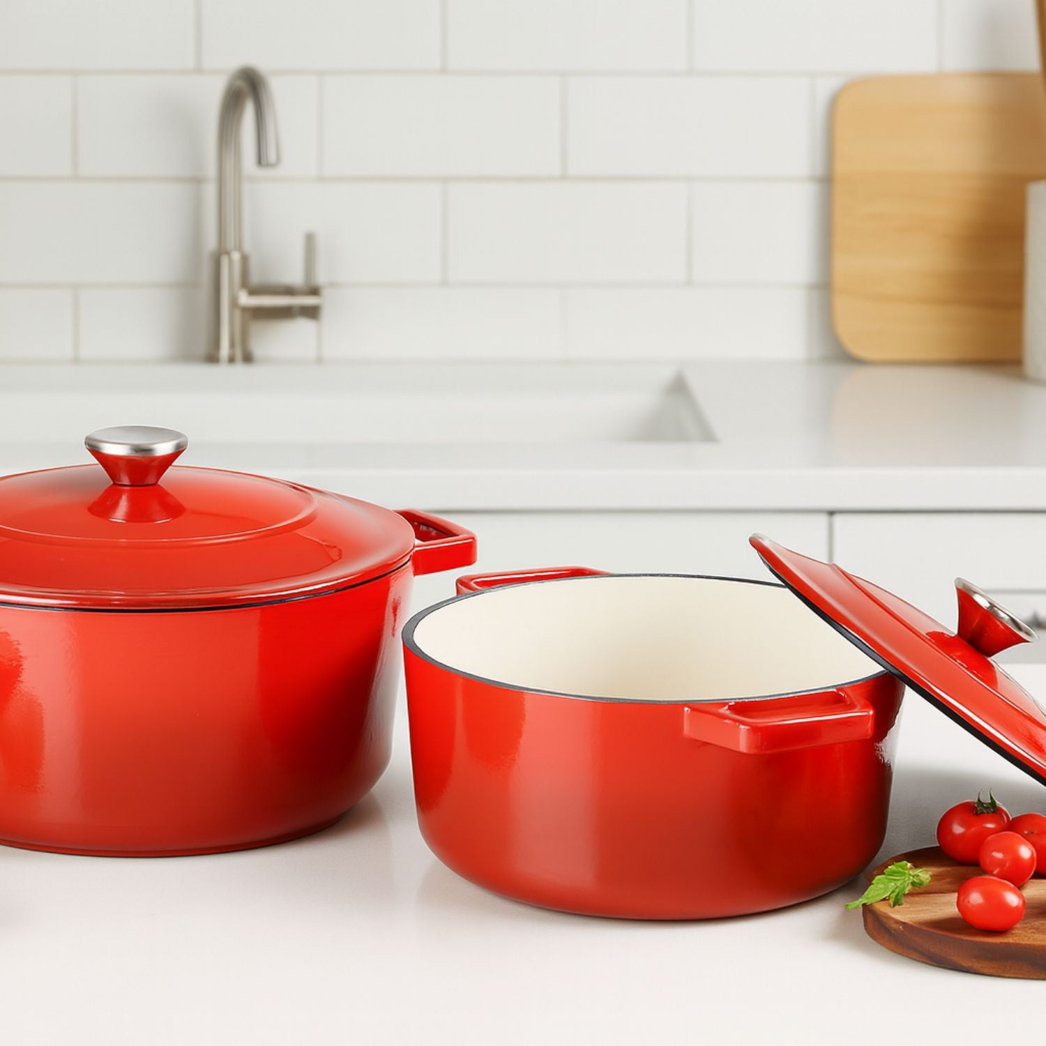 - Cacerola de hierro fundido esmaltado: material robusto que distribuye el calor de forma uniforme y lo mantiene durante más tiempo, logrando una cocción lenta y sabrosa.