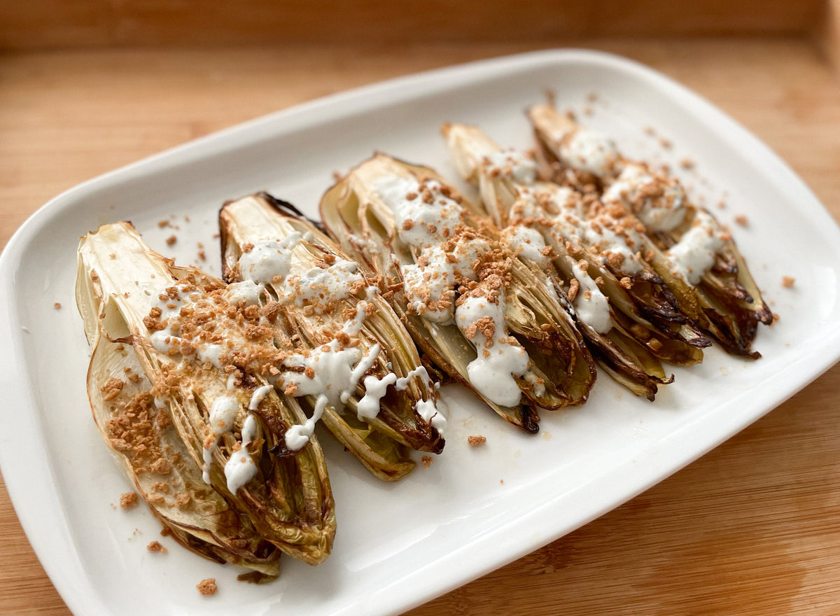 - Preparar la mezcla de aove, vinagre y soja/tamari y distribuirla por encima de cada endivia.