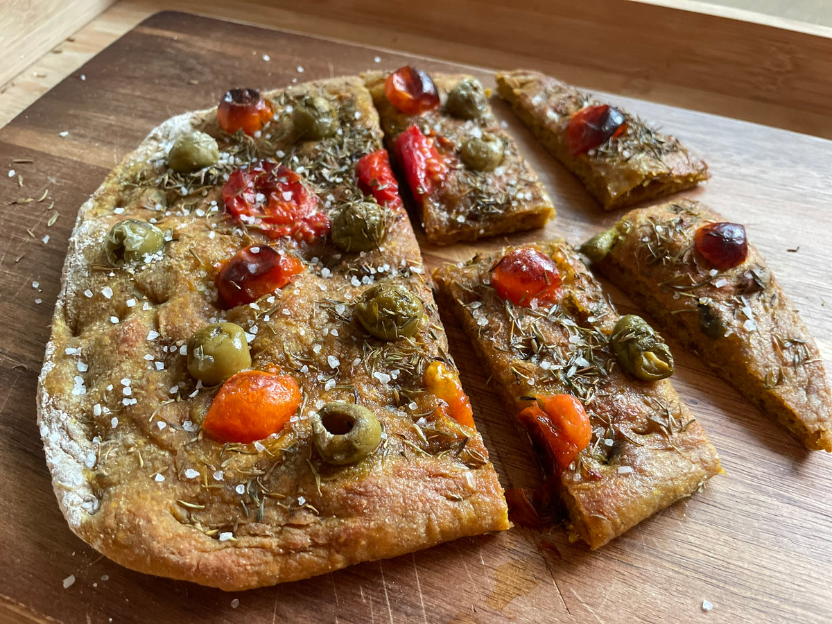 - Una vez precalentada, sacar el cestillo y colocar cuidadosamente la focaccia con el papel de hornear en la base y cocinar durante 10 min a 200ºC.