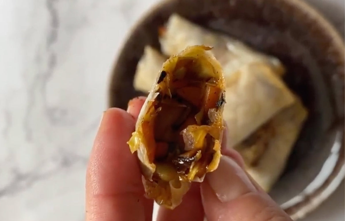 - Pincelamos los rollitos con muy poquito aceite y los cocinamos en la freidora 10 minutos a 180ºC.