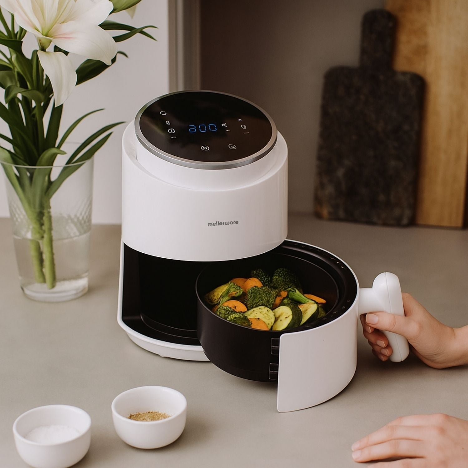 Com capacidade de 1,5 L, é ideal para quem vive sozinho ou em casal. Perfeita para dois lombos de salmão, batatas fritas ou um jantar rápido, sem ocupar espaço na cozinha. Graças aos programas automáticos e ao controlo digital, cozinhar saudável e saboroso nunca foi tão fácil (nem tão rápido).